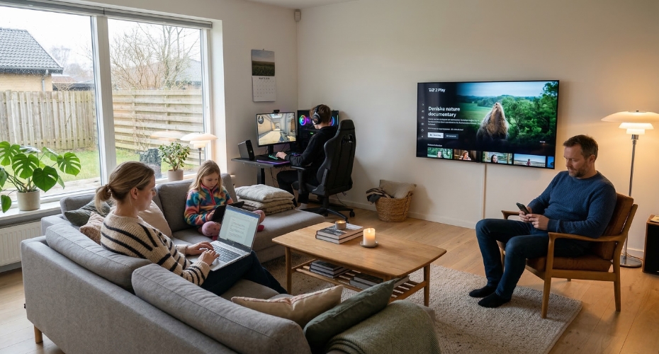 I Danmark er langt de fleste fiberforbindelser FTTH — fiber helt ind i boligen. Det er den bedste løsning, da du undgår flaskehalse fra kobber eller coax på det sidste stykke. Hvis du bor i en lejlighed med FTTB, er hastigheden stadig meget god — men FTTH er det optimale.